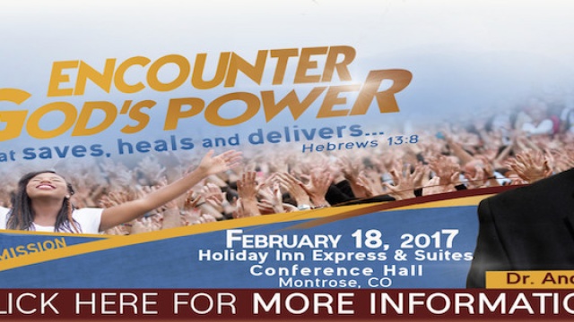Kingdom Impact Ministry is hosting “Encounter God’s Power”, an event open to the public that will be taped for TV broadcast. This event is on February 18th, 1:30 p.m., at the Holiday Inn Express Conference Center located at 1391 South Townsend Avenue in Montrose. Admission is free. Come and experience the power of God.